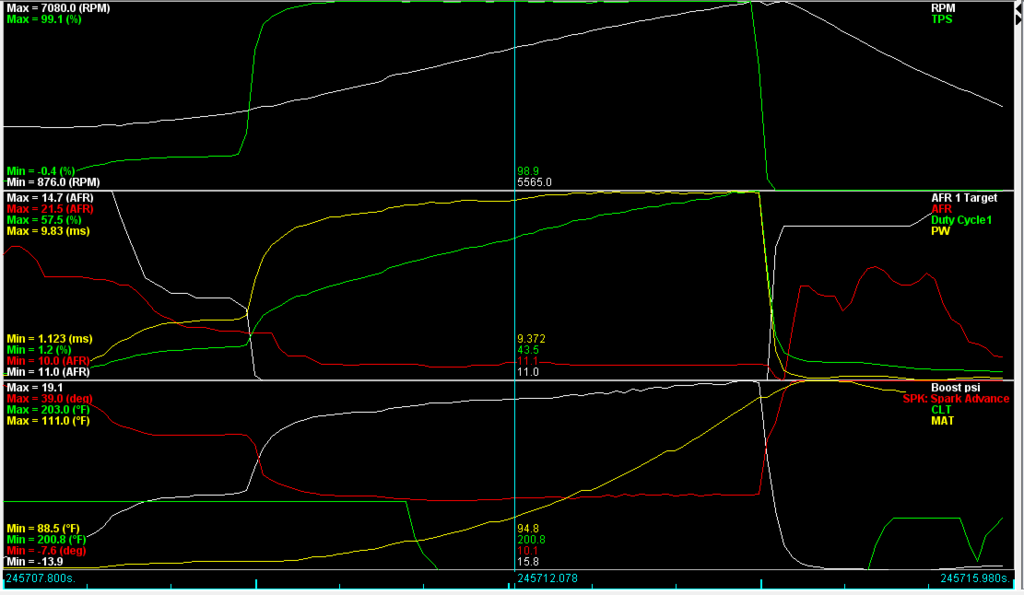 I hit 57.5% duty cycle, these injectors flow 1,175cc/min at 60 PSI fuel pressure. That means with 11.0:1 AFRs I was burning 675cc/min of fuel. That's a lot. People make 300whp with 550s and 11:1 AFRs, I'm burning more than that!