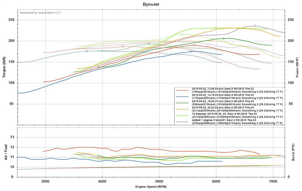 The last pull with 5 degrees shows to be down on power vs 4 degrees up to ~6,400, but I checked the log and the belt was slipping a bit and boost was higher on the 4 degrees pull vs the 5 degrees pull at those RPMs. At higher RPMs where boost is the same, 5 degrees made more power.