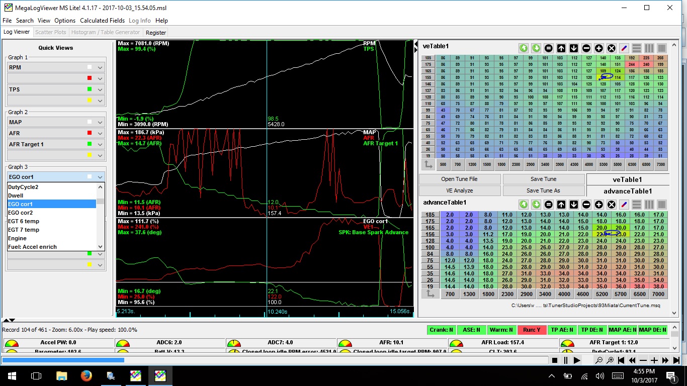My real concern at the moment is that in my log, the AFR would swing wildly up and down from max lean to target or below rapidly. The graph looks like a heart monitor. I've attached a pic to better visualize whats going on. What I'm not sure is if it is a WB controller or O2 sensor issue, or something in the tune. I do plan on eventually bringing the car to a tuner to get a proper dyno tune, but I would like to get my current tune as close to perfect as possible so the tuner only has to worry about tuning spark and fuel. I feel like I'm at the point where I know enough to be dangerous, and maybe have overlooked some simple setting. If anyone can take a look at my tune and make some suggestions that would be greatly appreciated. I'm especially interested in the WB controller settings and other setup type settings, as well as the overall tune, if anything looks way out of place. The screenshot from the log is a second gear pull. Thanks all!