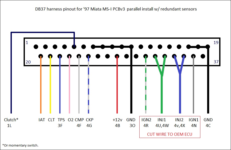 5. What pin on the Megasquirt's DB37 connector should I used for the clutch switch? I understand that launch control requires a variable TPS (on pin 22 of the DB37) and a connection to the clutch pedal switch (pin 1L on the Miata 64-pin connector). I have searched, but cannot see that anyone ever specified which Megasquirt pin they used.