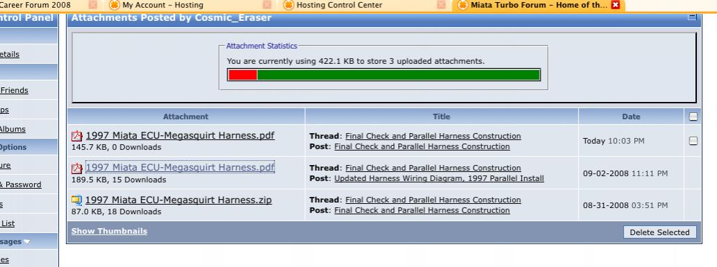 I still can't figure out how to delete old attachments. I checked the User CP without success. If case I'm missing something obvious, someone point out how easy it is. Under User CP, I only see how to delete the last item. Here's a screenshot of what I see. There is no check box available by the earlier attachments.