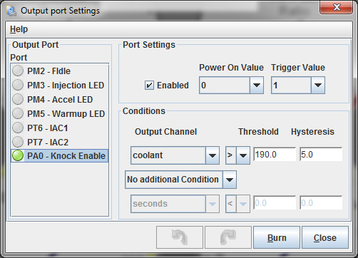 which output do you have running to the fan relay? Looking though the outputs, it looks like you have every one set to a different coolant temp, but only PT6 is enabled? You have the power on value at 1, with the trigger set to 0, which means the fan will be on with power, until the conditions (greater than 201) are met, at which point it turns off. Thermostats don't have a polarity, they are simply a bimetal sensor that changes resistance with heat. Mine looks like the attached, but, I am using PA0 for fan control. You may not be - ( I have mine set to 190 in this image, but i find my car nomally maintains 172-180 on the highway... so it is off most of the time)