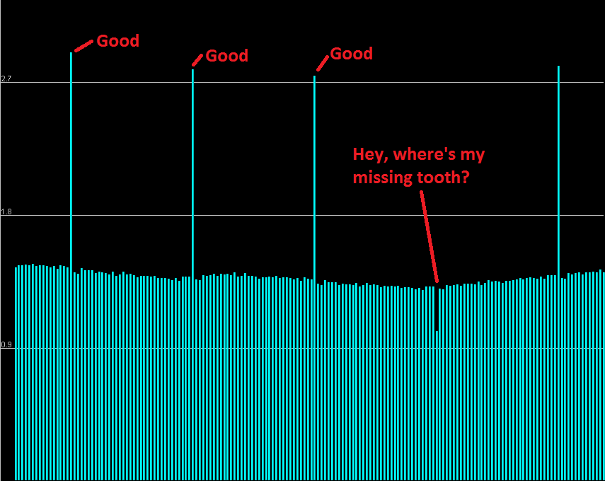 Here is an example of what a 36-1 wheel should (and should not) look like on a tooth log.