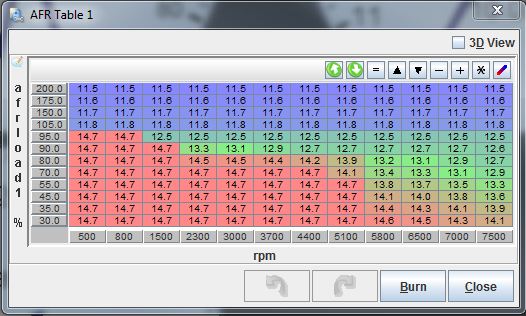 I think this is what I'm running right now. Notice how the numbers don't change too drastic like EunosBen's. This will cause smoother fueling, because when you autotune, it's not making a calculation from 14.7-11.8. It's stepping up in fuel in smaller increments. Try mine and see what happens.
