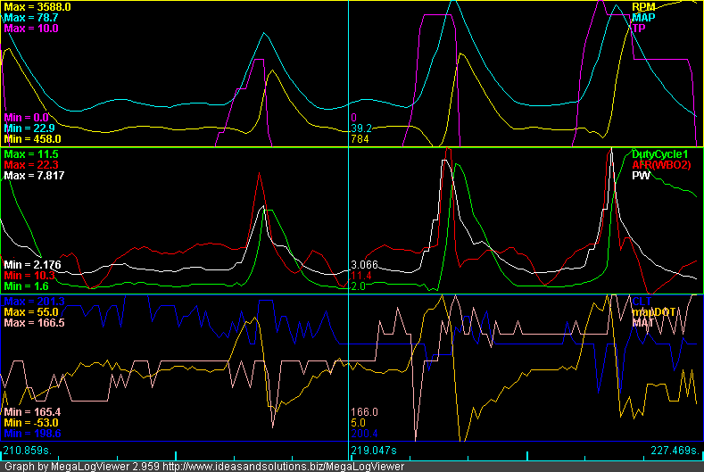 Setting the MAPdot lower than 100 KPa/s seemed to make the car impossible to start, though that may be EAE related. I'm not sure. At that point I gave up for the night. But I had to keep doing flood clear mode to get it to start becaue there was way too much fuel going in. If you look at the attached mlv, there is still an RPM drop at tip in off idle, even with a lot of extra fuel added in.