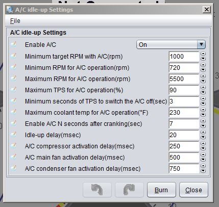 Post up your MSQ. As for the idle AC issue, you've likely got Closed loop idle set to use the "last known good value" so while you're cruising and the AC activates it ramps up Idle PWM, so when you stop Idle PWM is at a goofy value, like 62, when it should something closer to 35. MS recognizes that the idle is higher than the target and it slowly ramps back down. Setting Idle to use the Look Up table will eliminate this issue. You could probably use quite a bit of timing tweaking if you're still on the IHI (stock) MSM turbo, it should be spooling quite a bit faster, or your wastegate is possibly cracking early.