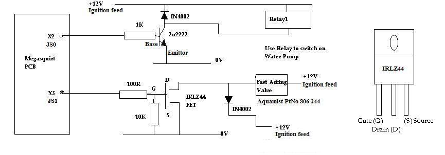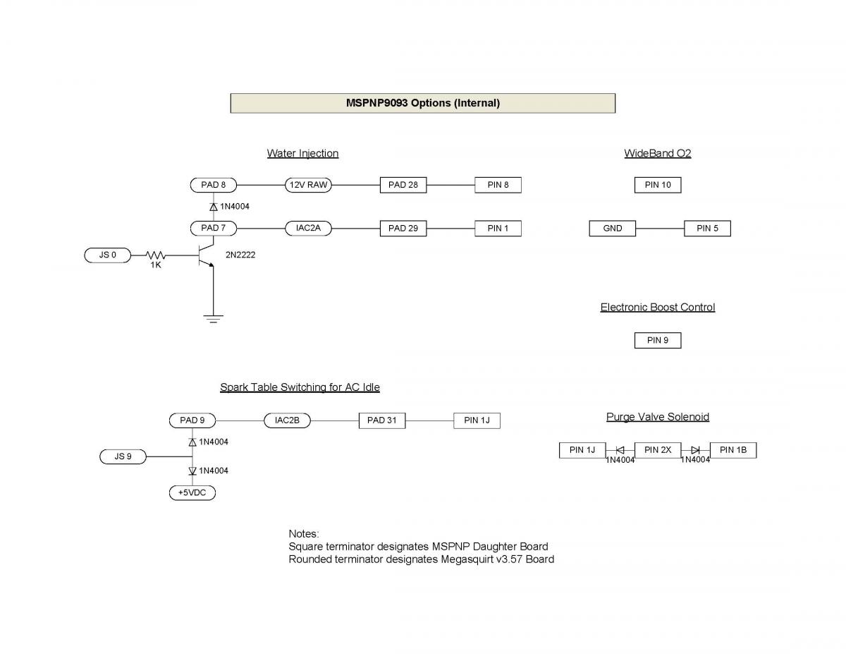 I implemented WI control through my MSPNP9093 as described in the MSNS-Extra Hardware Manual. See attachement. I only implemented the X2/JS0 circuit to turn the WI pump on and off with a relay ("relay 1" in the diagram). The circuit was implemented internally to the MSPNP with the "12V Ignition Feed" tied to internal, unregulated power and the "0V" tied to MSPNP ground. The only modification to the circuit is the use of a 1N4004 instead of the 1N4002 depicted.