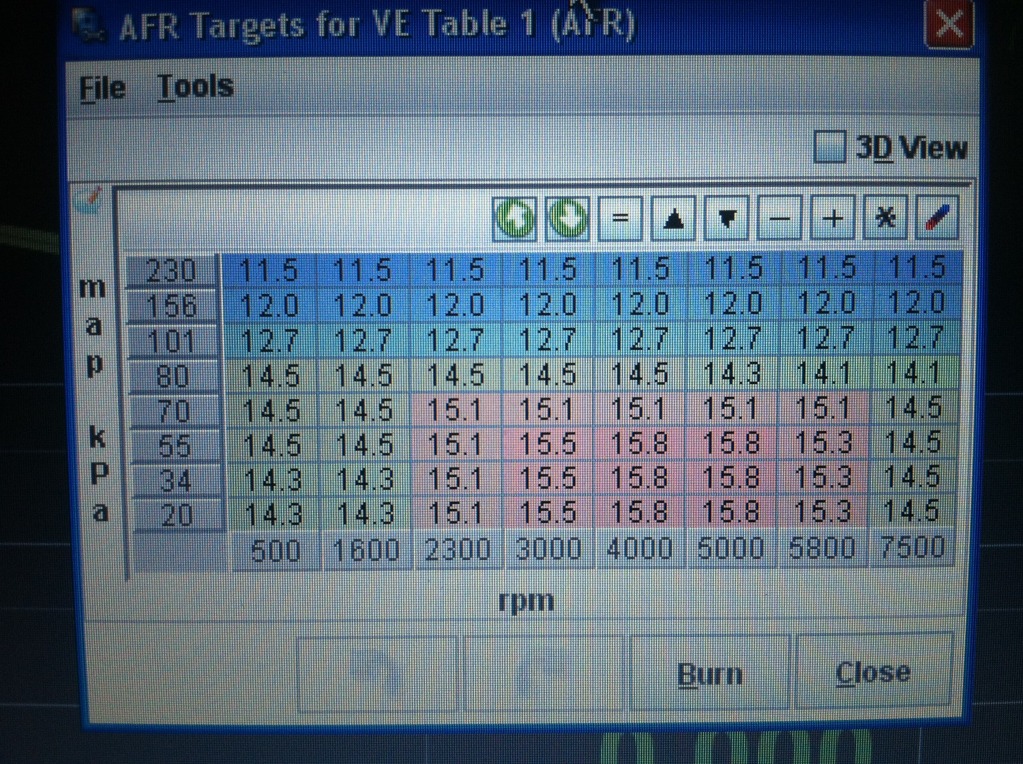 Many people dont get the idea behind the afr chart... its a wish list... just because you "wish" to tune for 12.0 doesnt mean you ARE running 12.0. In other words if ur fuel map is ****... thats what you'll be running until the autotuner has had a chance to correct it.