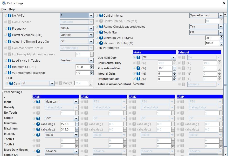 When tuning, create VVT Target, VVT Duty, and VVT Angle gauges and watch them carefully as you accelerate through your RPM targets. I do not run VVT based on load, only on RPM, this created the smoothest operation for me.