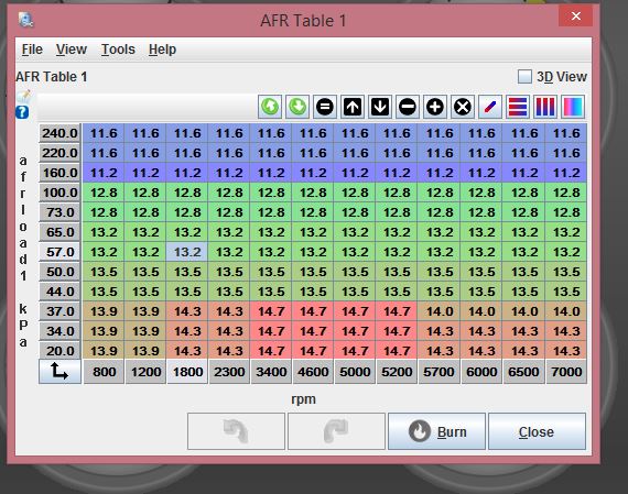 okay so this is the AFR target table. the wideband and AFR's match perfectly. theres no fuel leaks as ive installed new piping and clamps. tank dosent leak either so everything is fine there. and it runs the same as before apart from the AWFUL fuel consumption