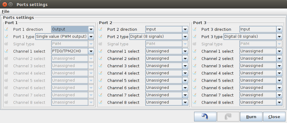 Set port type to 'single value (PWM output) and then choose either TPMCH0 or TPMCH1