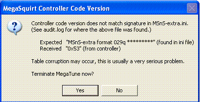 my MS has 029v loaded on it, and my laptop has 029q. When I load megatune, I get that error, because the laptop is running q and the MS is running v. It hasent gave me any problems, I just push the load megatune anyway buttton.