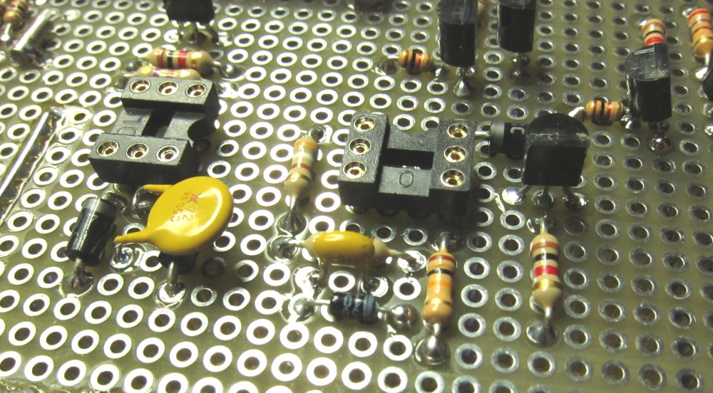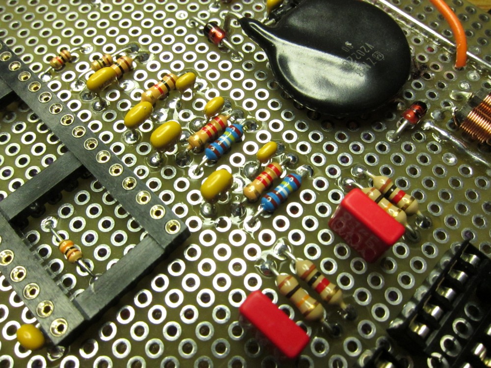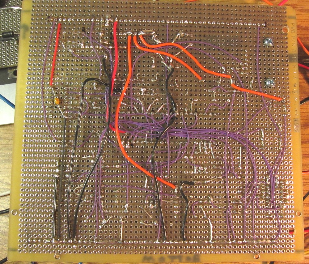 This is just a regular perfboard with copper-ringed holes, through-plated. The first pic I posted was kind of old, here's some detail showing further progress: