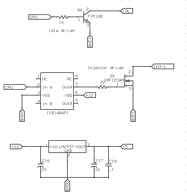 At the Injector driver, I can see a potential fault with what I have right now. During the turn-on phase, a bit of current flows from +12 through the gate driver and into Q1, then down to IGND. No problems there. During the turn-off phase, however, I suppose that a bit of current is going to sink from Q1 through the driver and down to AGND, and that could potentially cause some ripple on the AGND line. I should probably move that ground to IGND.