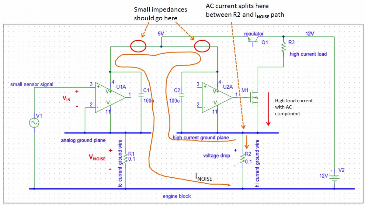 See schematic below. The high current through the load always has an AC component, e.g. the step components in injector currents. The AC current flows down through the MOSFET, through the high current ground plane, and splits between the high current ground wire and the two 100 uF bypass caps. If the tops of the bypass caps are connected together, they effectively connect the 2 ground planes with a low impedance (to AC), just like if you shorted them. The noise current flows down analog ground wire which develops a voltage across it. This voltage appears in the analog input stage U1A. It sees as the input voltage, Vin = V1 + Vnoise.