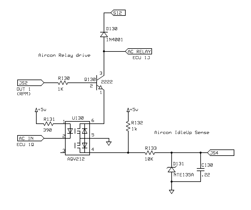 - JS2 is one of the four general-purpose outputs of the CPU, specifically "Out 1". I have configured this output to be active when RPM is greater than 800, and turn off below that. 100 RPM of hysteresis is implemented in software. This pin, along with Q130, acts as the "first switch" for the AC relay. When RPM falls below 800, the transistor will turn off, disengaging the AC and (hopefully) preventing a stall.