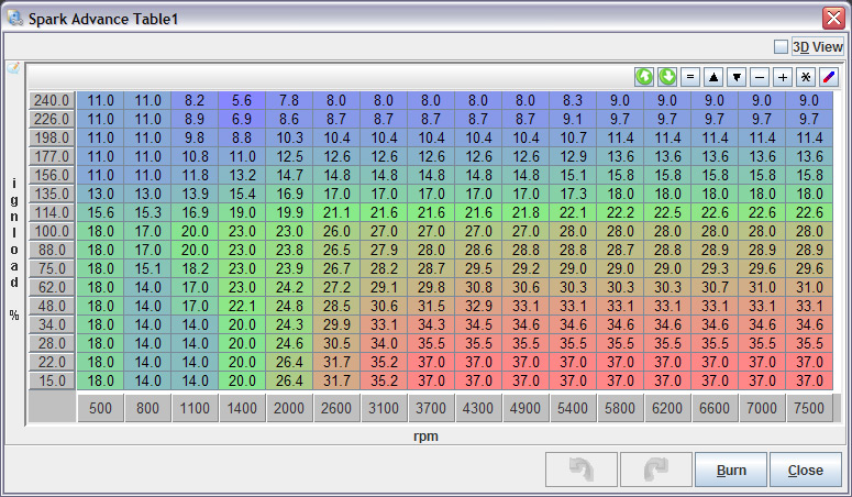 Here's my ignition table. I believe it's basically the DIYPNP base timing map, and some of the weird decimal values probably got there when I upgraded to MS3 and it extrapolated the values for 16x16 instead of 12x12, and I never bothered with the timing except for the idle cells. Anyway, I did not bother to take out any timing before running the test. It was running around 23-25* in the cells hit during the 15 and 25 mph tests.
