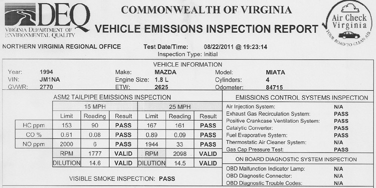 94 Miata, n/a, stock motor and exhaust with original cat, MAF is not hooked up so I believe this renders the EGR inoperative, MS3/X running sequential fuel, COPs in wasted spark mode, RX-7 550cc injectors, LC-1 WBO2, 93 octane. Datalog of the smog test and my MSQ are attached.