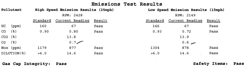 Passed this time with 0 CO and 36 HC, idling at 16.x AFR. We only do an idle test here, although if you fail, they have you rev it to 2500 for 15 seconds to try and heat up the cat, then let you try again, I didn't even need the 2500 test this time, last time I failed so bad he didn't even let me.