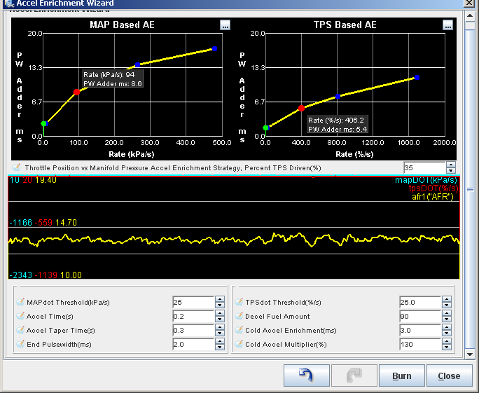 I'm now experiencing the joy of tuning accel enrichments. I tried EAE but disabled it to use normal AE since I didn't feel like putting in the hours to get it right...yet. That and normal AE has been used by many of you for years so I thought it couldn't be that hard to set up.