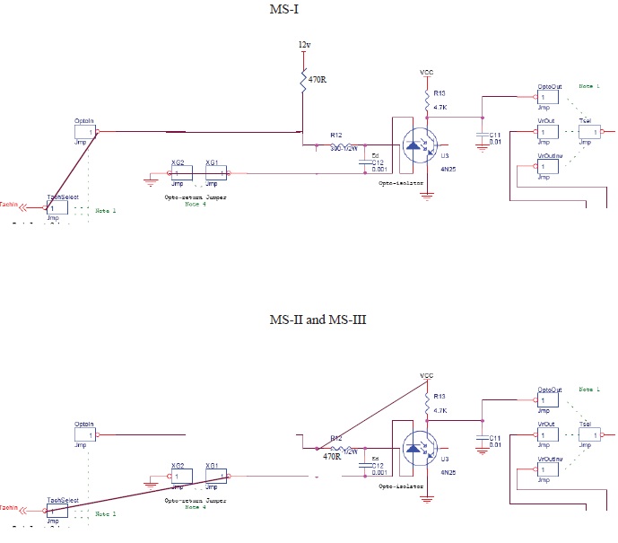 The miata CAS has an inverted polarity on one output compared to the other. On the MSI the typical TACHSELECT to OPTOIN | TSEL to OPTOUT input is all you need for the crank, however, the cam signal is invereted.