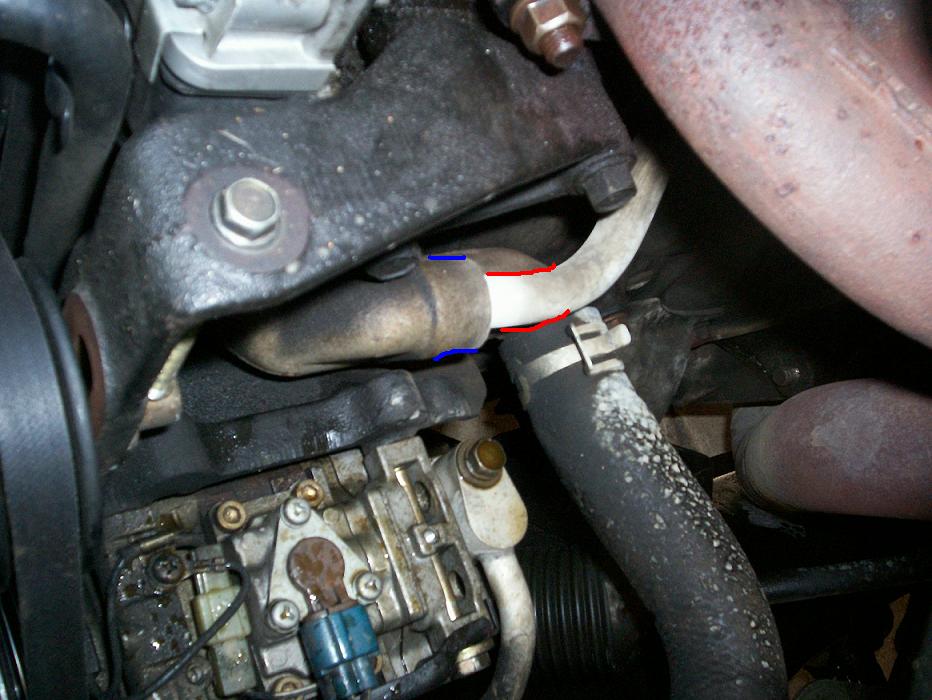 The hard pipe that runs rearward to the heater core (marked in red) seperated from its fitting on the block (marked in blue). Is that what's called the mixing manifold? The hard pipe moved back a few MM, we just shoved it back forward so it could seat itself again. But I doubt that it's permanately secured.
