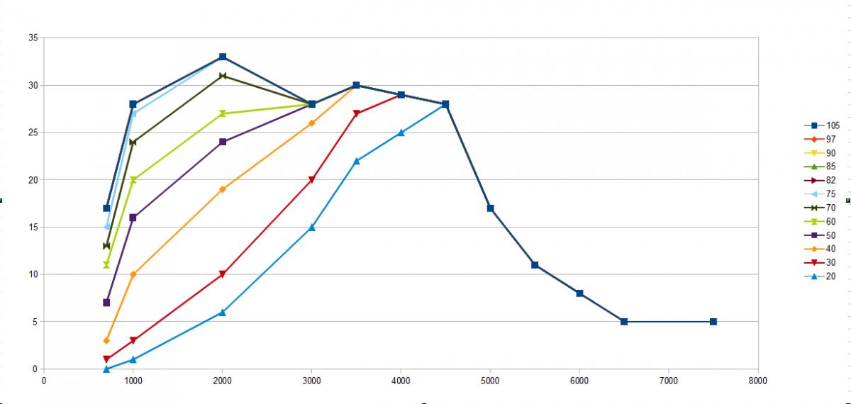 DIY 700 1000 2000 3000 3500 4500 5500 6500 85 17 28 33 28 30 28 11 5 82 17 28 33 28 30 28 11 5 75 15 27 33 28 30 28 11 5 70 13 24 31 28 30 28 11 5 60 11 20 27 28 30 28 11 5 50 7 16 24 28 30 28 11 5 40 3 10 19 26 30 28 11 5 30 1 3 10 20 27 28 11 5