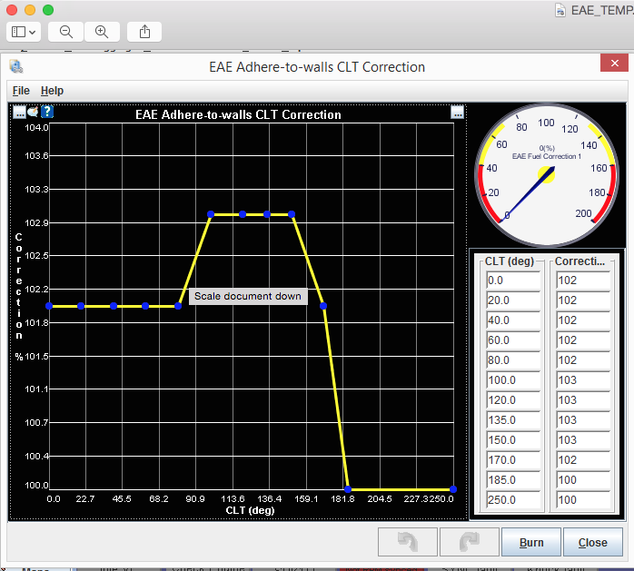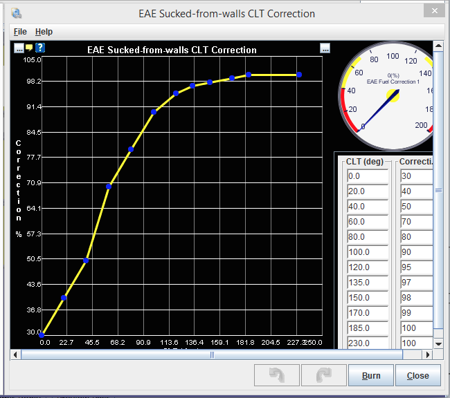 5) If the theory matches reality, then mine makes sense. When cold, one should expect the fuel to not want to evaporate from the puddle. However, that is not why I have this CLT curve. It is because, on cold starts, the SFW, even when MAP was still in the 80-85 kPa range, would pull so much fuel as to actually go to zero pulse width. This was way too much and would kill engine or cause ugly stumble. With this curve, I don't get that.