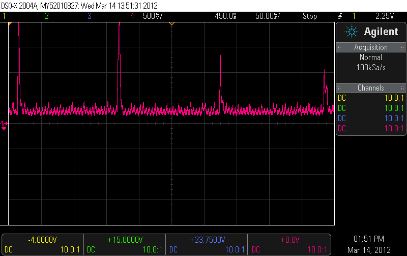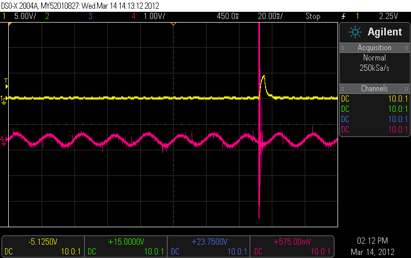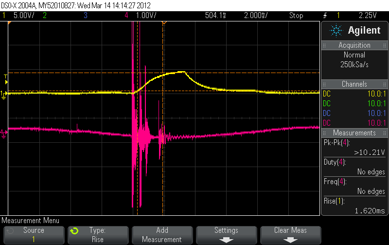 Raw stock knock sensor output (pink) Vs the filtered output going to the MS2 (yellow) - you can see that the stock sensor is of the resonant type.