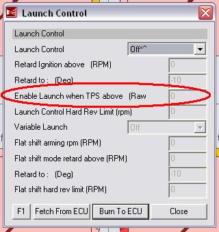 The box says enter a RAW tps value, I assume that means ADC. My WOT ADC is 255, so I could enter in say 200... That way I could always leave launch control active, not have an extra switch in the dash, and it would only activate if the clutch is pressed in AND I'm at a pretty high throttle position. Seems to me it would work great, with the only potential issue being that variable launch might be tricky or work right. But if I'm right, then I could just leave lc and flat shift on in software all the time.