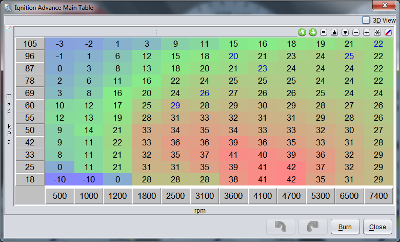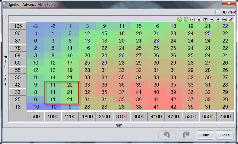 Huge jump in timing from 1000-1200 rpm, 25-42 kPa. That is probably not the static table in the ECU, but observations made, with AC and idle compensation included. Such a static table will cause severe idle instability.
