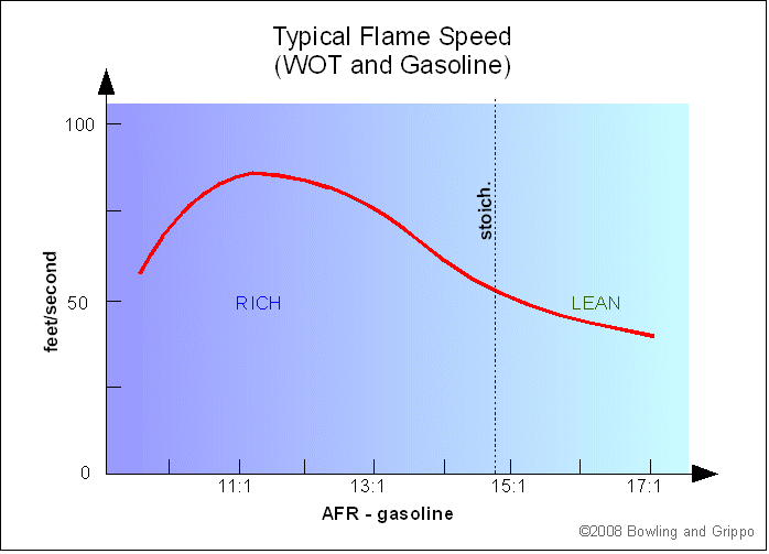 The tip is around 12.5 to 13:1. Go richer or leaner and flame speed slows. Starting from 14.7:1 and going leaner slows flame speed. Starting from 12:1 and going richer also slows flame speed.