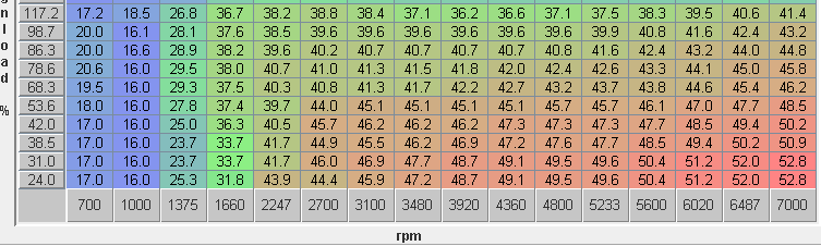 If I take that table at face value, it means that the OEM ECU on a '97 car is running spark advance in the high teens / low 20s at the very top, which is roughly 20° less than I have on my engine at the moment.
