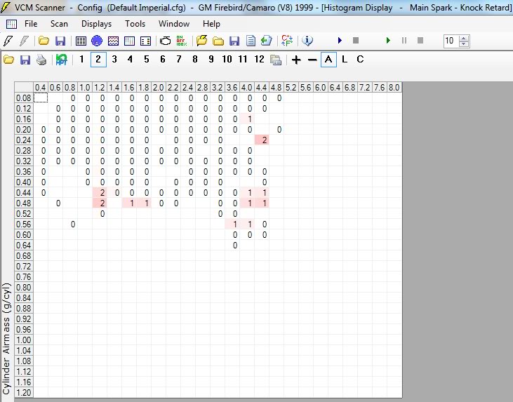 Literally histogram plot that matches your spark table, except instead of your advance values in the cells you have the peak knock retard value for that cell. Makes spotting the areas you knock a lot easier, though you normally dont have to pull as much timing as the listed KR value since it takes more timing removal to get rid of knock already happening than to prevent it.