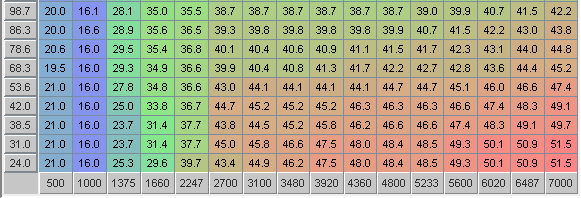Looking at all of these spark maps, the advance curve in any given row is pretty flat when viewed from left to right. Say we look at Ben's 75 kPa row. At 2,900 RPM (call it 3,000) he's at 31°, and from there until 7,000 RPM it only increases to 33°. This general trend is typical of all rows of most spark tables I have seen.