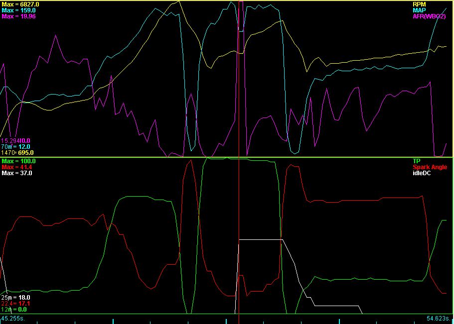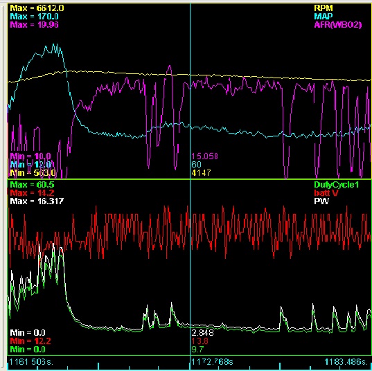 The pulse width and duty cycle both jump up for a split second, causing AFRs to dip down to 9-10:1. This mainly happens in vacuum (10-20in on boost gauge), and below 4500rpm...basically when I'm cruising in 4th or 5th.