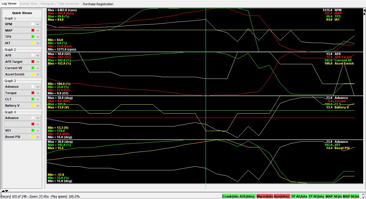 Also, it doesn't break up like that in 4th or 5th gear. I hit 20psi at about 4000rpm and it will hold steady, no breakup, no apparent issue in 4th or 5th gear. Only happens in 1-3rd gear. And occasionally when this happens the car will go into almost a limp mode where the AFRs are all over the place, and the car is like jerky and bogging and has no power and it almost dies and then it will just clear up suddenly and drive normal. I really have no idea what the hell is going on. Im on a speeyefi, not a megasquirt. Same tuning software, same datalog software. I will post some datalogs here in a little while