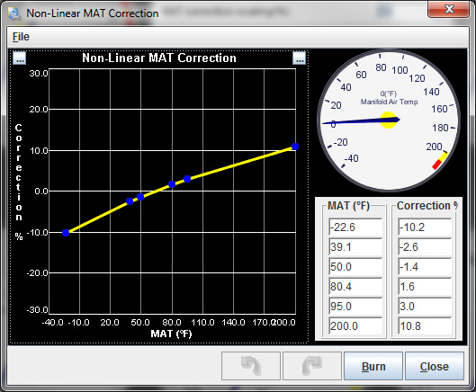 I found changing the correction value wasn't a good idea for MAT corrections when the car was actually running. On cold days it went lean, switched it back to 100 value and all was good. Sadly we have no way to taper off the non-linear MAT correction table with RPM like MS1 can.....that would solve our issues I think for hot starts.