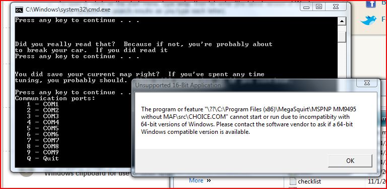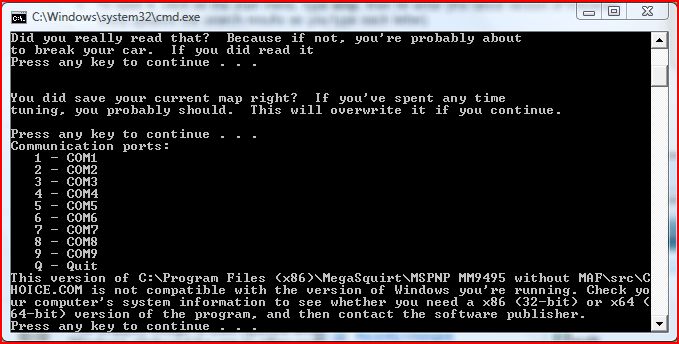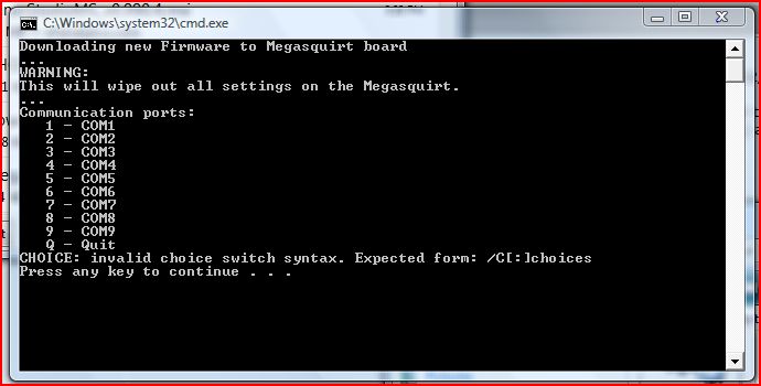 Attached is a copy of the newer version of choice.exe(one named "choice.exe" and the other "choice.com", both are the same file). Drop them into the src folder(C:\Program Files\MegaSquirt\[version]\src) and see how it runs. Only other problem I see is download.exe not being compatible with 32-bit, but we will see.