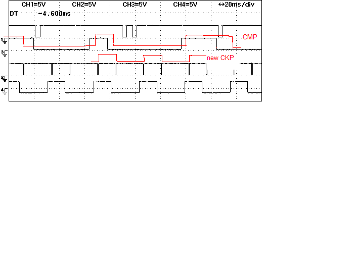 New CMP will be triggered from FALLING edges of CKP. The exact location wrt crank degrees will be different than an NA CMP signal, but the edge sequences between CKP and CMP will be the same as the NA signal. i.e. short CMP pulse always "straddles" a CKP rising edge, and the long CMP pulse always straddles the whole CKP pulse 360 crank degrees later. When the NB CKP falling edges go funky, the CMP edges will move much earlier, but the edge sequence will not be violated.