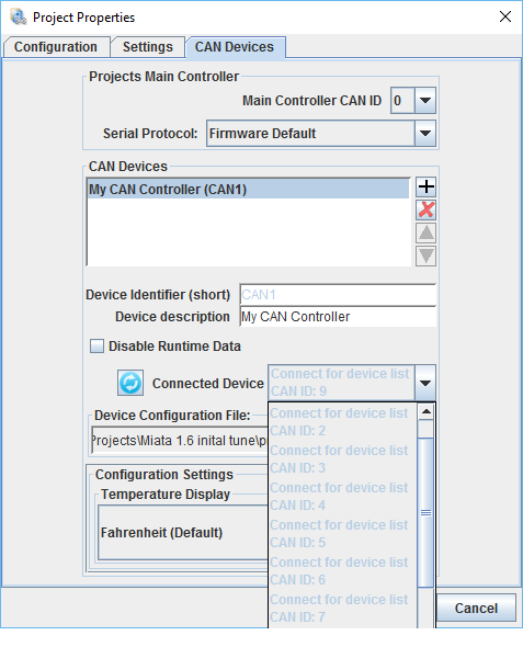 All of the options for CAN Devices are grayed out. If I disconnect my computer, configure the module to use CAN1, then hook it back up I get a warning that the CAN1 device is being taken offline when the ECU reconnects. I have tried writing these settings to the controller, switching the ignition on and off to no effect. At no point when the ECU is powered on and the computer connected do I ever see one of the items in the Connected Device drop down menu not grayed out.