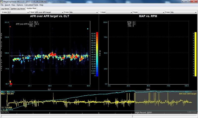In order to tune WUE, I'm using MegaLogViewer. I've created a custom field: 100*[AFR]/[AFR Target 1]. On a scatter plot, I map it against CLT and use hits on the Z axis.