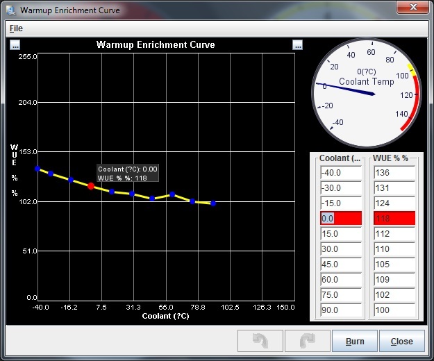 Say the custom field value is 95 at 0 degrees Celsius (slightly rich), I multiply the WUE % by 0.95. So far it has been a breeze to get the AFR to match the AFR Target through the temperature range. Below is my current WUE table. It is tuned down to 0 degrees and below that point it's a best guess.