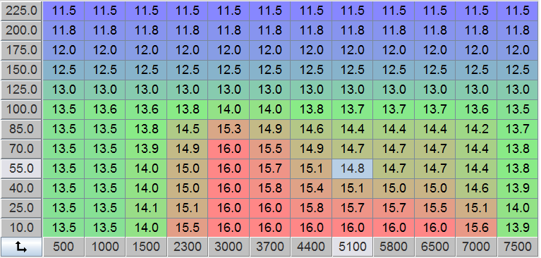 You can typically run 30 degrees up to 100kpa. Your high boost high rpm cells have too much timing. You don't need more than 14 on the top row.