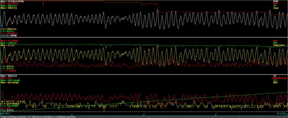 Ok I went back and changed all the temps to F. After it cooled a bit I was able to get it started again and it ran really rough and rather lean for a bit but it did smooth out again (see first log). After letting it warm up again I plugged the idle valve back in and changed the VE table to get it to 14.2ish and then started turning the manual idle screw. I guess I ended up turning it a little too much because it stalled and then it was back to the old no restart thing. I'll let it cool again and then try later.