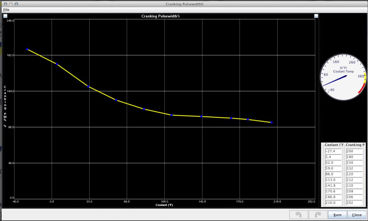 I still had a difficult time trying to start the car but finally got it to start after numerous attempts but it died quickly a couple of times and then didn't want to restart. I started playing around with adding more fuel to the lower left area of the table again like with the original tune and got it to run for the longest time yet but it was running pretty rich again and oscillating wildly. The thing doesn't want start without adding fuel but it runs too rich when it actually starts so I'm not sure what to do at this point.