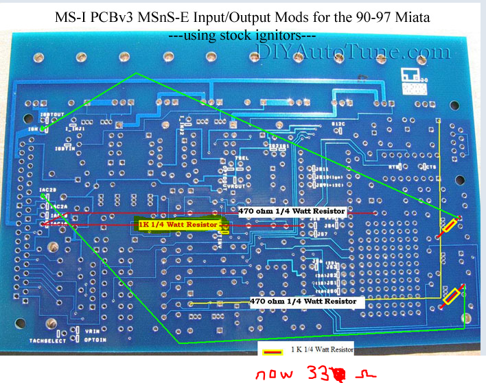 Tried 1/4 watt 100 ohm. No spark. Tried 330 ohm instead. I now have spark on cylinders 2 and 3 and d14 flashes rapidly. D16 does not flash. No spark on cylinders 1 and 4. Tried comparing the results to the stock computer...the stock computer sends out about half as many spark pulses over the same time interval and still sparks on all cylinders. I'm thinking the issue may be with the CAS output on IAC1A. Would replacing the highlighted resistor (see attached) with a 330 ohm hurt anything?