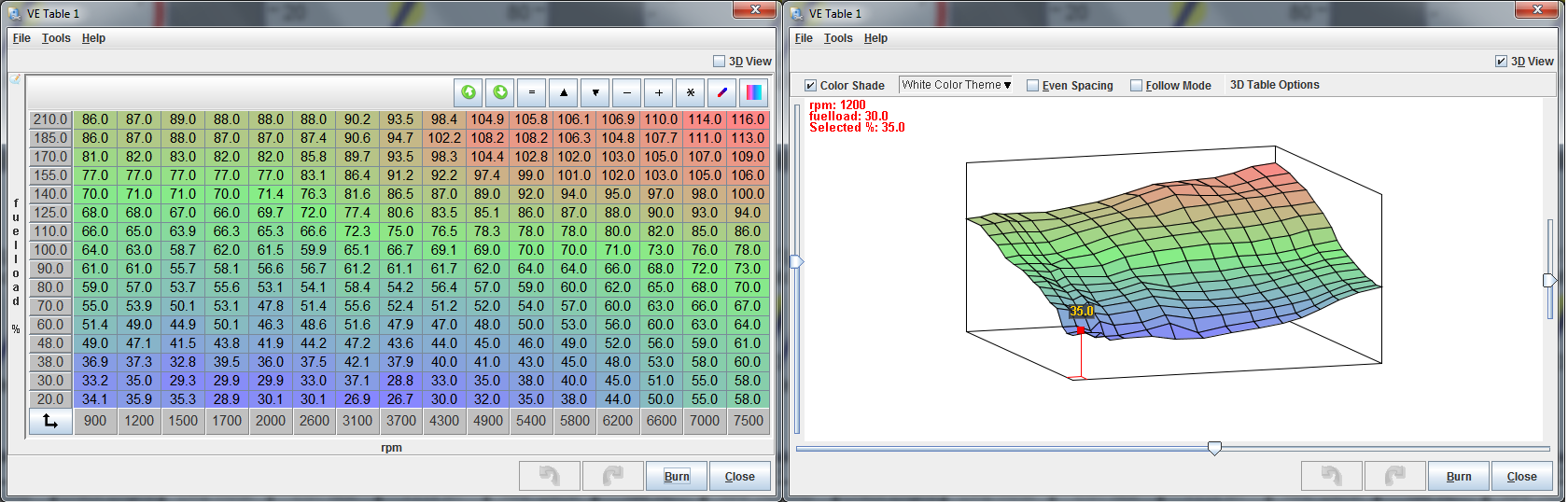 My VE map has a spread of 85 - 142 ( 57 points) nowhere near the resolution of yours.