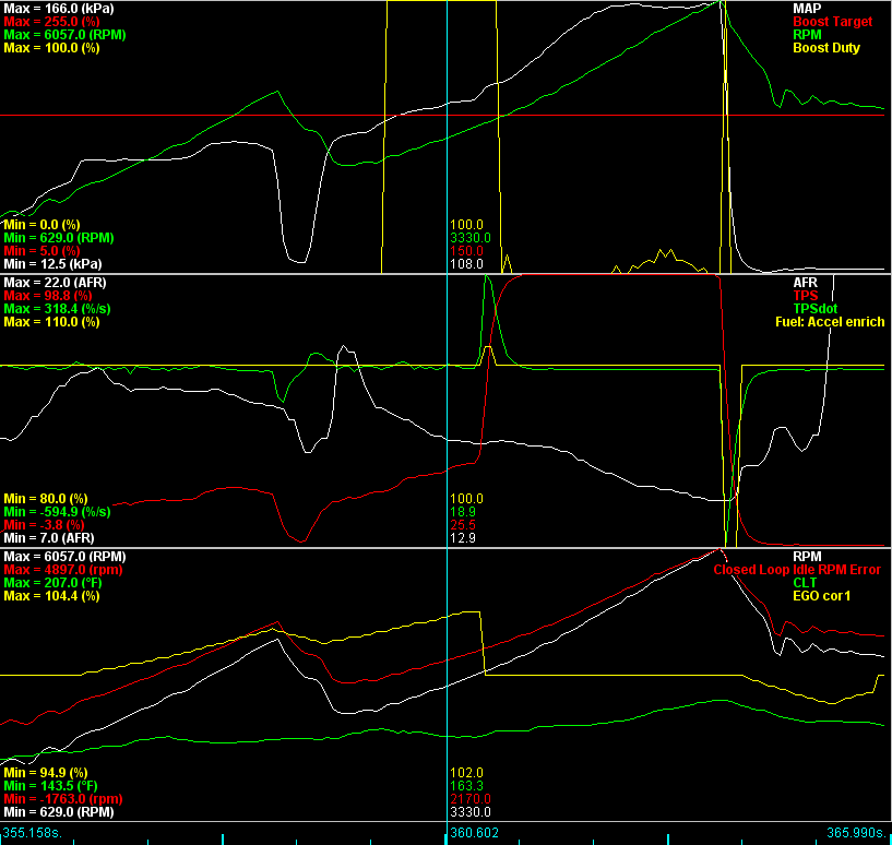 I've inverted the valve settings so I can get the valve to close at idle and such, that is venting the wastegate = 0% DC, this is what that looks like. I am using the initial value table, full of 0% DC, yet it still snaps to 100% DC which is bad for spool as seen here. My wastegate is set pathetically weak, like 130kpa, so any amount of duty on the valve bleeds a lot of boost.