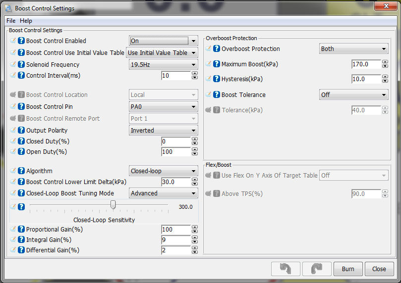 The initial value helps a lot. Without digging into PID controls too much it basically gives the closed loop equation something to start off of. It makes a pretty big difference in the overall picture. Test your wastegate, make sure its not blowing open. Then do some pulls in open loop to find your initial values, before you start start tuning PID. Start at 100, and lower by 10 until you effect spool (mine was 65% duty cycle). Set your max duty cycle to that. Then lower by 5 each pull and compare the logs to find at what RPM you get what boost, at what duty cycle. Then fill out the initial duty cycle, and start with P=100, and lower it until you get a bit of a overshoot, then tune I, etc, etc.